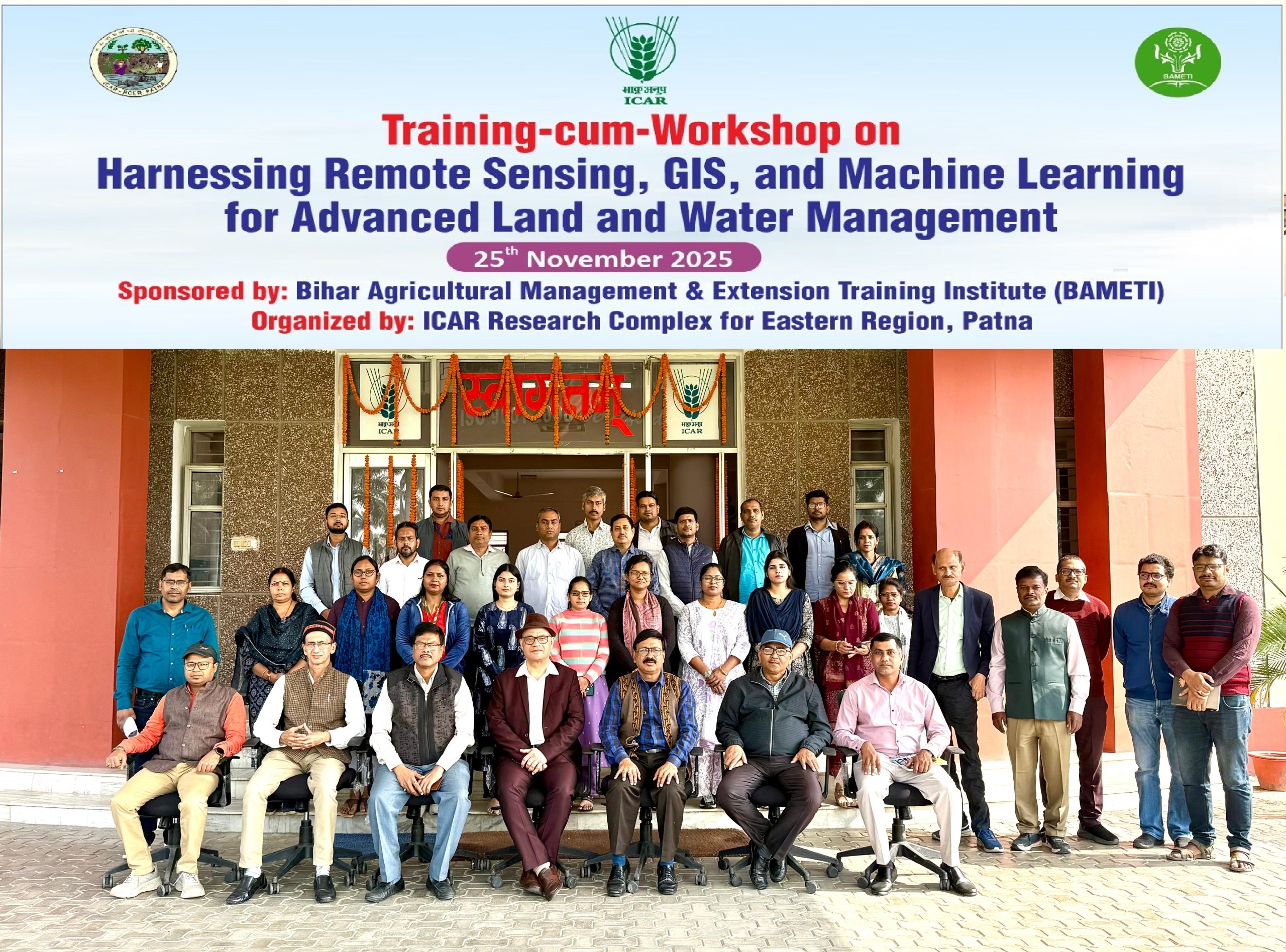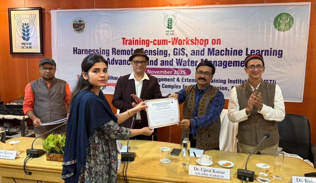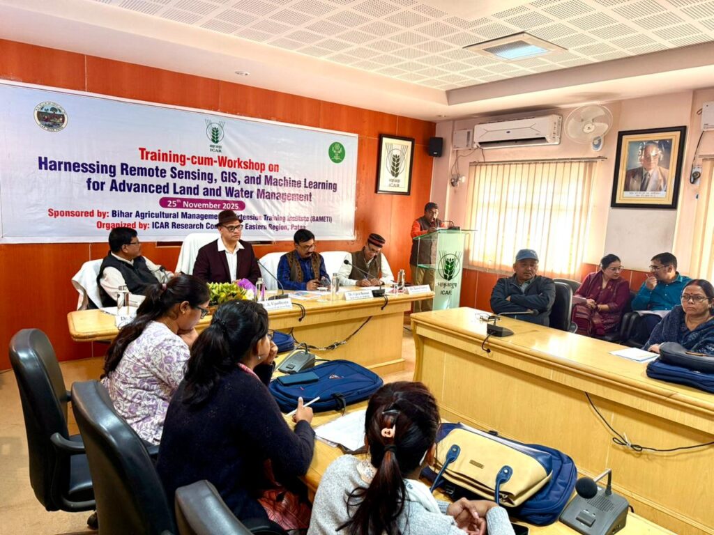 पटना: भारतीय कृषि अनुसंधान परिषद का पूर्वी अनुसंधान परिसर, पटना में दिनांक 25 नवंबर 2025 को “आधुनिक भूमि एवं जल प्रबंधन को रिमोट सेंसिंग, जीआईएस एवं मशीन लर्निंग का उपयोग” विषय पर एक दिवसीय कार्यशाला का आयोजन किया गया। उपर्युक्त कार्यशाला बामेती, पटना प्रायोजित रहा। कार्यशाला में पटना, गयाजी, सारण, वैशाली और जहानाबाद जिला से बिहार सरकार के विभिन्न विभाग के कुल 24 प्रतिभागियों ने सहभागिता सुनिश्चित किया। इनमें 12 एटीएम/ बीटीएम, 6 कृषि समन्वयक, 4 प्रखंड कृषि/ उद्यान पदाधिकारी तथा आत्मा के 2 उप परियोजना निदेशक, आत्मा शामिल हुए।