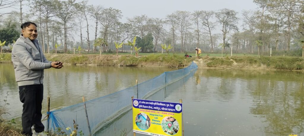 पश्चिम चम्पारण जिला के मझौलिया प्रखण्ड स्थित कृषि विज्ञानं केंद्र मधोपुर के तालाब में मखाना सह मछली पालन प्रारम्भ कर दिया गया है। उसकी जानकारी माधोपुर कृषि केंद्र के वरीय वैज्ञानिक व प्रधान डॉ.अभिषेक प्रताप सिंह ने देते हुए बतया कि इस नवाचार के लिए मखाना की सबसे उन्नत और लोकप्रिय किस्म ‘स्वर्ण वैदेही’ का चयन किया गया है। उन्होंने जानकारी देते हुए बताया कि केंद्र के तालाब में इस किस्म के बीजों की सफल बुवाई कार्य सम्पन्न हो चुका है। ‘स्वर्ण वैदेही’ किस्म अपनी उच्च उत्पादन क्षमता और कम समय में तैयार होने की विशेषता के कारण वैज्ञानिकों और प्रगतिशील किसानों की पहली पसंद बनी हुई है। उन्होंने बताया कि इस प्रदर्शन इकाई का मुख्य उद्देश्य जिला के किसानों को मखाना उत्पादन की आधुनिक तकनीक से अवगत कराना और उन्हें जागरुक करना है। जिला में प्रचुर मात्रा में तालाब और ‘चौर’ व जलजमाव वाले नीचले क्षेत्र हैं। डॉ. सिंह ने इस तकनीक से होने वाले लाभ पर प्रकाश डालते हुए कहा, “मखाना और मछली पालन का यह एकीकृत मॉडल किसानों के लिए एक ‘वरदान’ है। इसमें तालाब के जल का उपयोग मखाना उगाने के साथ-साथ मछली पालन के लिए भी किया जाता है। मखाना के पौधे तालाब के ऊपरी भाग में विकसित होते हैं, जबकि मछलियाँ पानी के नीचे स्तर पर पलती हैं। इससे न केवल संसाधनों का कुशल प्रबंधन होता है, बल्कि खेती की लागत में भारी कमी आती है।