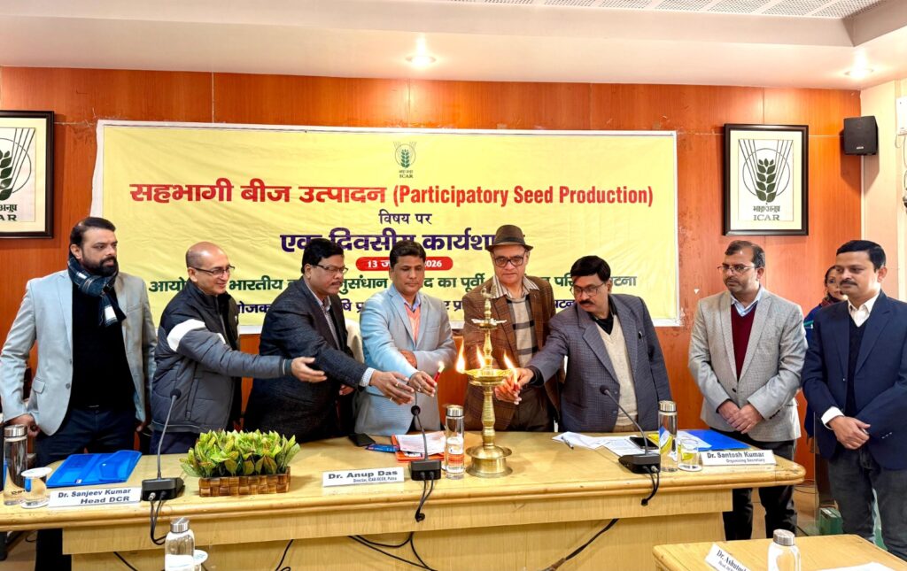 पटना : भारतीय कृषि अनुसंधान परिषद का पूर्वी अनुसंधान परिसर, पटना में दिनांक 13 जनवरी, 2026 को एक दिवसीय सहभागी बीज उत्पादन कार्यशाला का सफलतापूर्वक आयोजन किया गया। यह कार्यक्रम बामेती, पटना प्रायोजित कार्यशाला में बिहार के विभिन्न छव जिला गया, पटना, वैशाली, नालंदा, भोजपुर एवं जहानाबाद से आये किसानों एवं प्रसार कर्मियों सहित कुल 24 प्रतिभागियों ने सक्रिय सहभागिता की। कार्यक्रम का श्रीगणेश वंदे मातरम् के सामूहिक गायन से हुआ, तत्पश्चात दीप प्रज्वलन एवं आईसीएआर गीत का आयोजन किया गया। कार्यक्रम की अध्यक्षता करते हुए संस्थान के निदेशक डॉ. अनुप दास ने कृषि में गुणवत्तापूर्ण बीज की निर्णायक भूमिका पर प्रकाश डाला तथा सहभागी बीज उत्पादन को बीज प्रणाली को सुदृढ़ करने का एक प्रभावी माध्यम बताया। उन्होंने किसानों को समय पर गुणवत्तापूर्ण बीज उपलब्ध कराने की आवश्यकता पर भी बल दिया। जिससे फसल उत्पादन एवं किसानों की आय में वृद्धि सुनिश्चित की जा सके। उन्होंने किसानों से आह्वान किया कि वे संस्थान के तकनीकी सहयोग से बीज उत्पादन कार्य को अपनाएँ।
