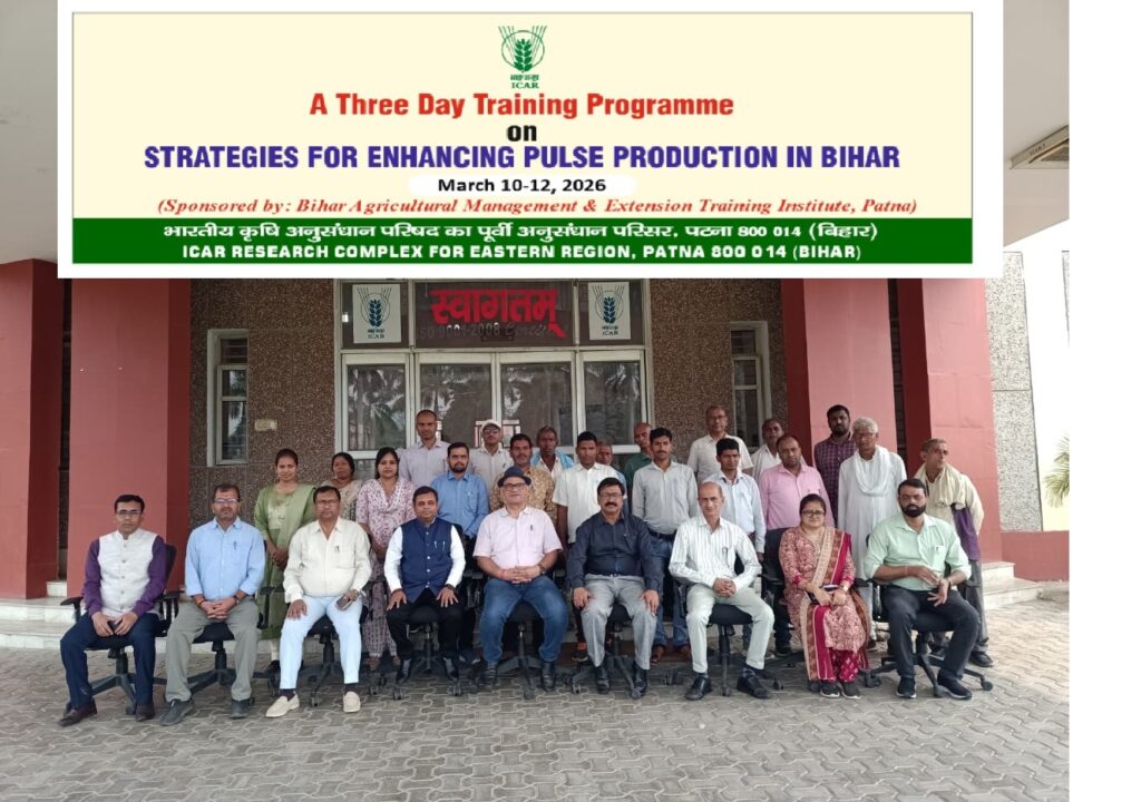 पटना : भारतीय कृषि अनुसंधान परिषद का पूर्वी अनुसंधान परिसर पटना में दिनांक 10 मार्च 2026 बुधवार को ‘बिहार में दलहन उत्पादन बढ़ाने की रणनीतियाँ’ विषय पर तीन दिवसीय (10–12 मार्च, 2026) प्रशिक्षण कार्यक्रम का श्रीगणेश हुआ। उपर्युक्त प्रशिक्षण कार्यक्रम बामेती पटना प्रायोजित है। जिसका उद्देश्य किसानों तथा प्रसार कर्मियों के ज्ञान एवं कौशल का विकास करना है, जिससे बिहार में दलहन उत्पादन एवं उत्पादकता बढ़ाने के लिए उन्नत तकनीक को अपनाया जा सके। इसके साथ ही कार्यक्रम में वैज्ञानिक फसल प्रबंधन पद्धतियों तथा दलहन की टिकाऊ खेती को बढ़ावा देने पर विशेष बल दिया जा रहा है। इस प्रशिक्षण कार्यक्रम में बिहार के पाँच जिला पटना, औरंगाबाद, नालंदा, भोजपुर तथा गयाजी से प्रसार कर्मी एवं किसान शामिल हैं। उपर्युक्त प्रशिक्षण कार्यक्रम में कुल 20 प्रतिभागी में 04 सहायक प्रौद्योगिकी प्रबंधक, 01 प्रखण्ड प्रौद्योगिकी प्रबंधक, 06 किसान सलाहकार तथा 09 प्रगतिशील किसान शामिल हैं।